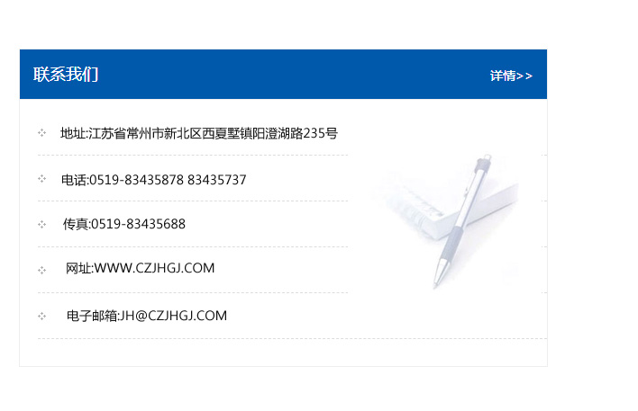 地址:常州市新北區友邦商務大廈1幢16、17層  電話:0519-85101652  傳真:0519-85112595  郵編:213022  網址:www.cz-jiayue_cn.lbdiandinuan.com  郵箱:xiajifengaa@163.com
